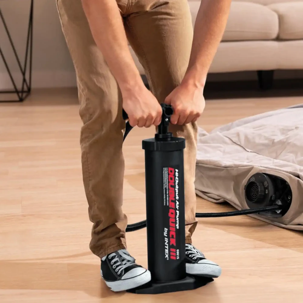 Pompă manuală de aer Double Quick III, 48 cm, ideală pentru umflarea rapidă a saltelelor gonflabile, piscinelor, bărcilor și altor produse gonflabile. Sistemul cu dublă acțiune pompează aer atât la împingere, cât și la tragere, asigurând umflare eficientă, iar furtunul flexibil cu 4 duze permite conectarea ușoară la diferite tipuri de supape. Compactă și practică pentru camping, vacanțe sau utilizare acasă.