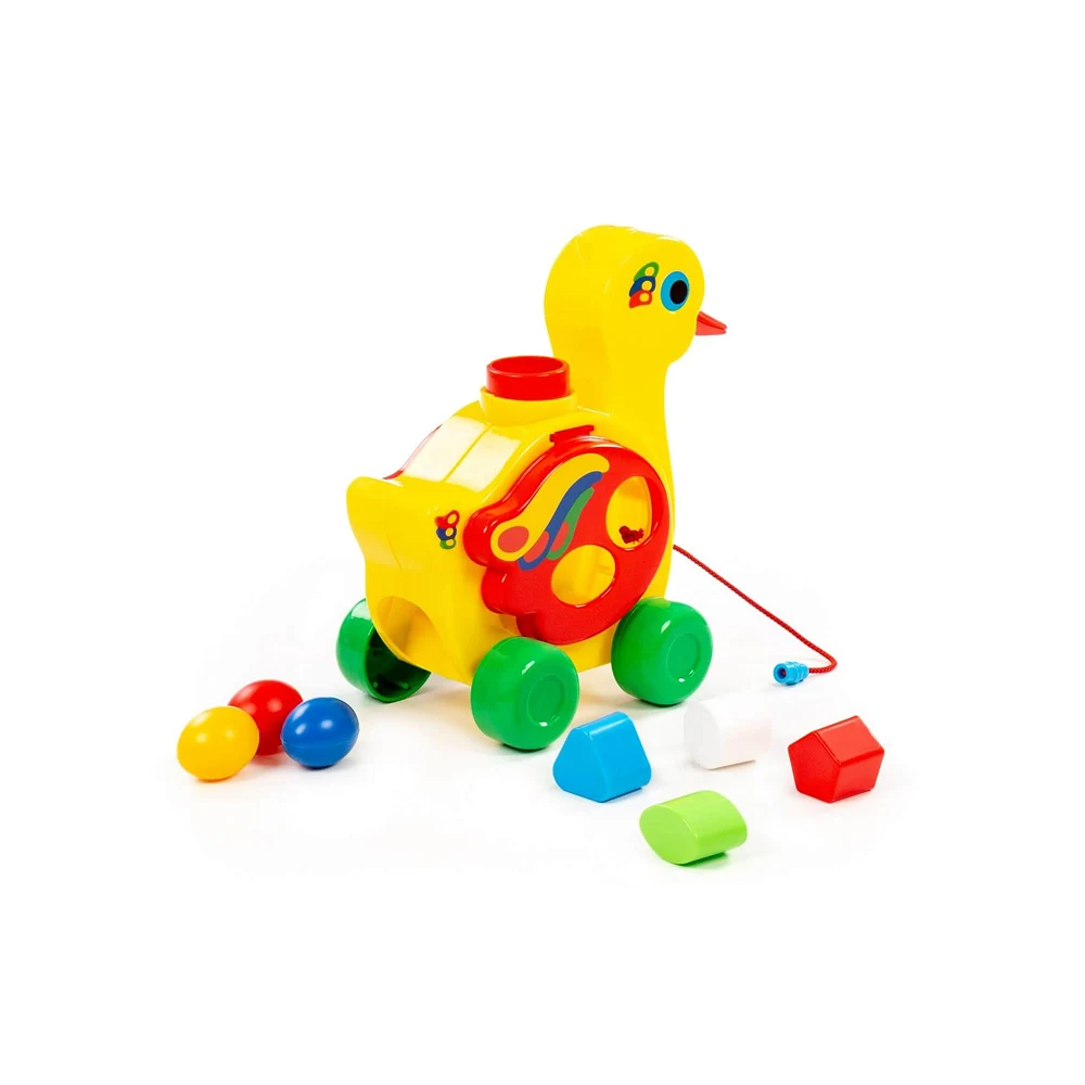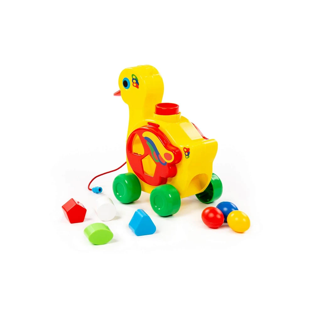 Rățușcă educativă colorată cu sorter de forme și șnur de tras, ideală pentru dezvoltarea motricității fine și a recunoașterii formelor, destinată copiilor de la 1 an.