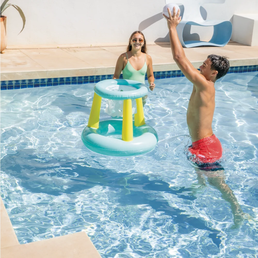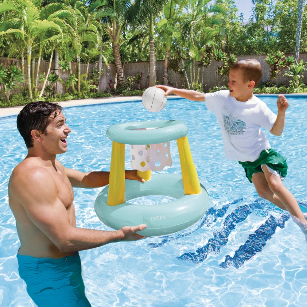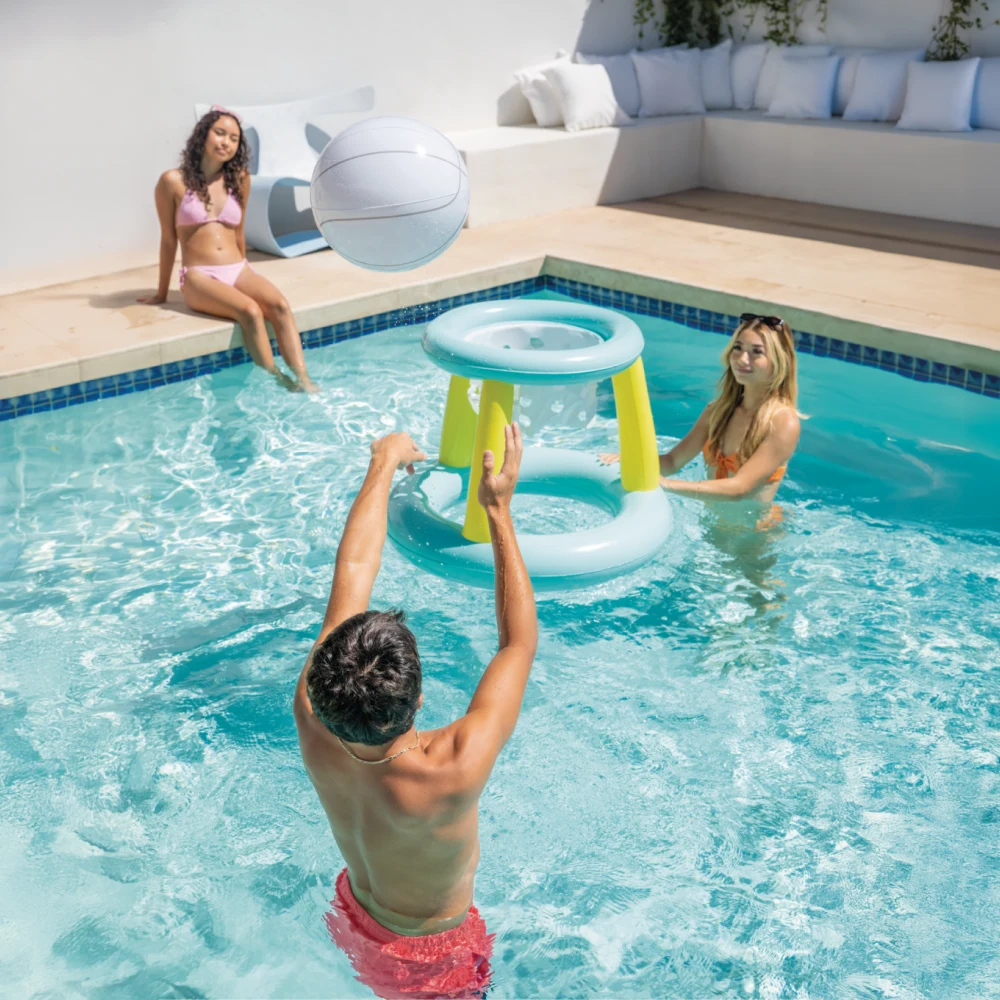 Set de joacă gonflabil pentru apă, ideal pentru distracție activă în piscină. Coșul de baschet plutitor și mingea inclusă transformă joaca în apă într-o activitate plină de energie și voie bună.