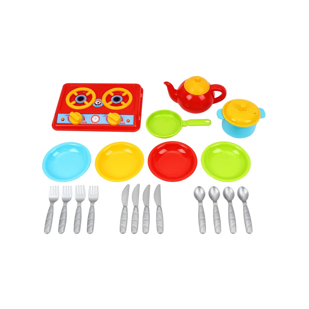 Set de veselă pentru copii cu aragaz de jucărie și accesorii complete, ideal pentru jocuri de rol și distracție creativă.
