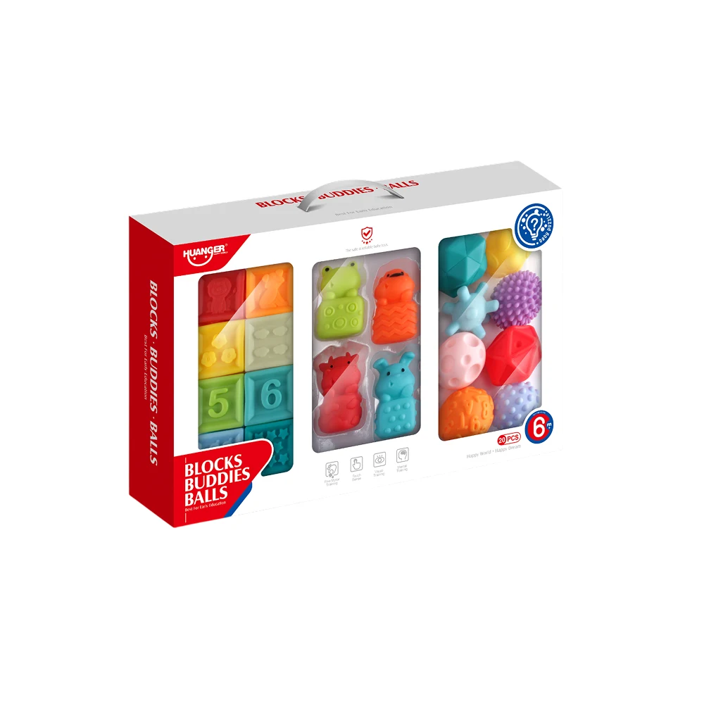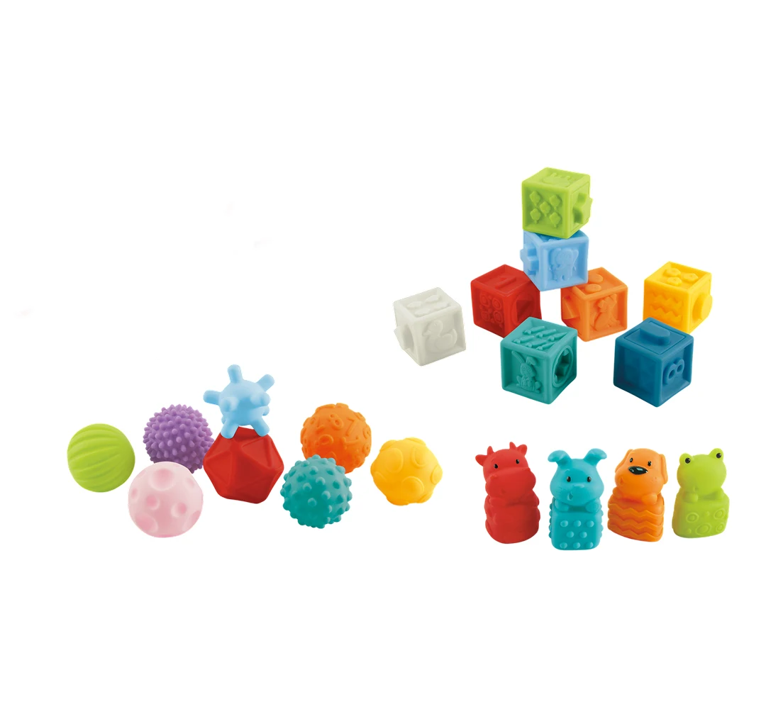 Setul conține cuburi moi pentru construcție, mingi senzoriale cu texturi diferite și figurine cu animale moi, special concepute pentru a fi ușor de apucat și manipulate de mâinile mici. Texturile variate stimulează simțul tactil, iar culorile vii atrag atenția și mențin interesul copilului în timpul jocului.