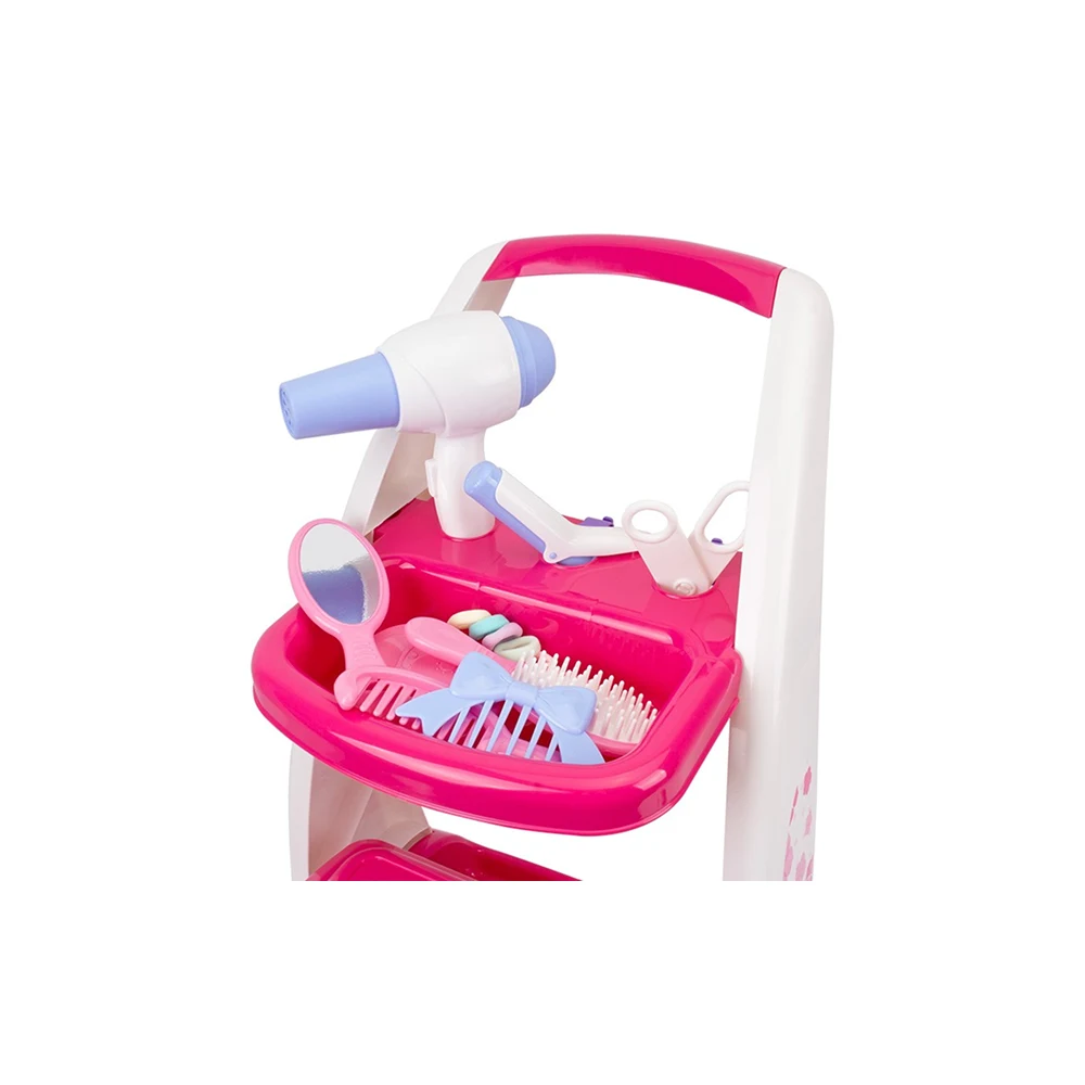 Setul de frizerie pentru copii este o jucărie educativă ideală pentru jocuri de rol, care transformă joaca într-o experiență distractivă și creativă. Include accesorii de coafură și un suport pe roți, perfect pentru micii stiliști.