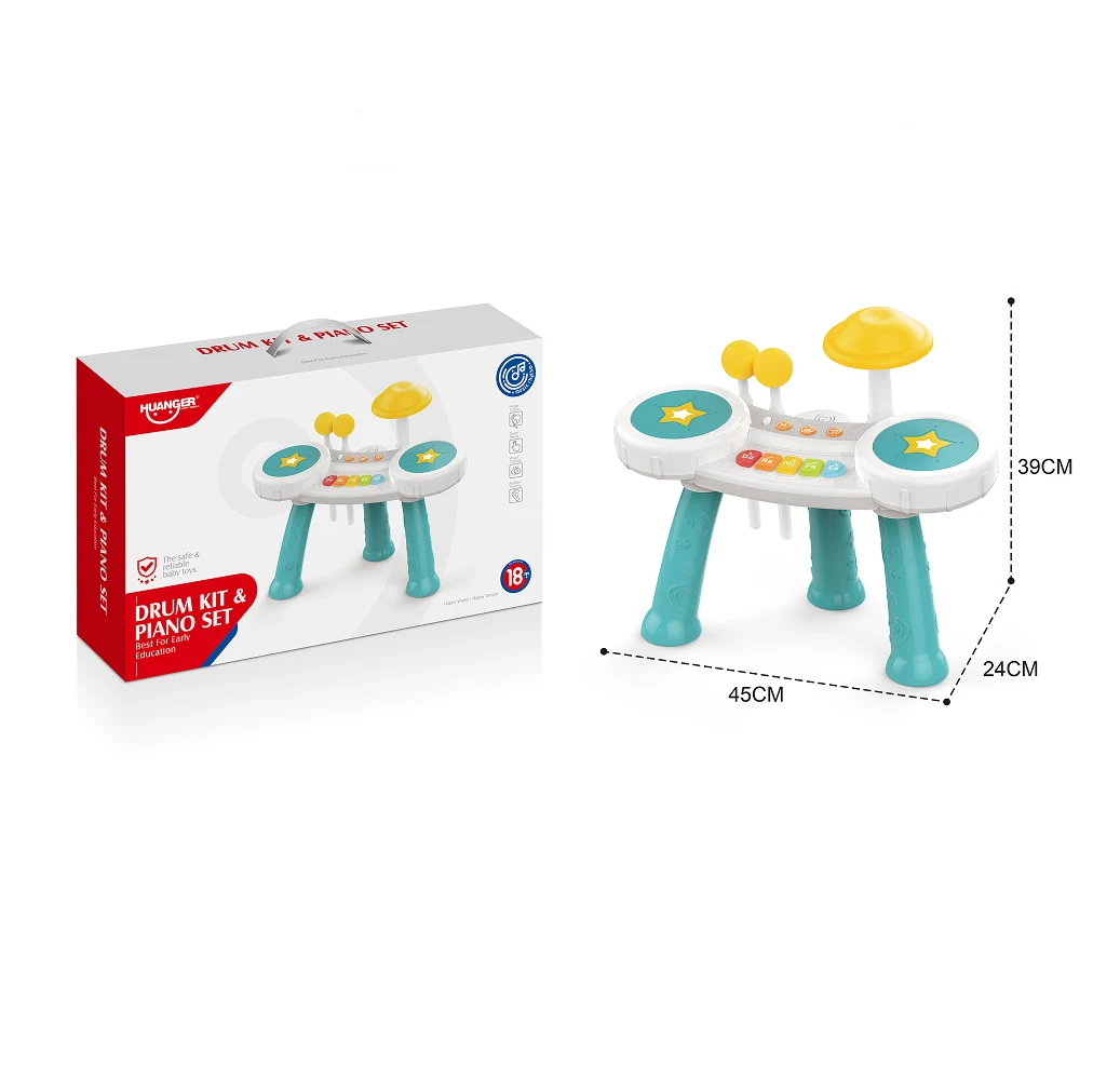 Setul este prevăzut cu tobe, butoane muzicale și elemente interactive care emit sunete și lumini, stimulând atenția și interesul copilului. Prin lovirea tobelor și apăsarea butoanelor, copilul își dezvoltă coordonarea mână-ochi, motricitatea fină și simțul ritmic.
