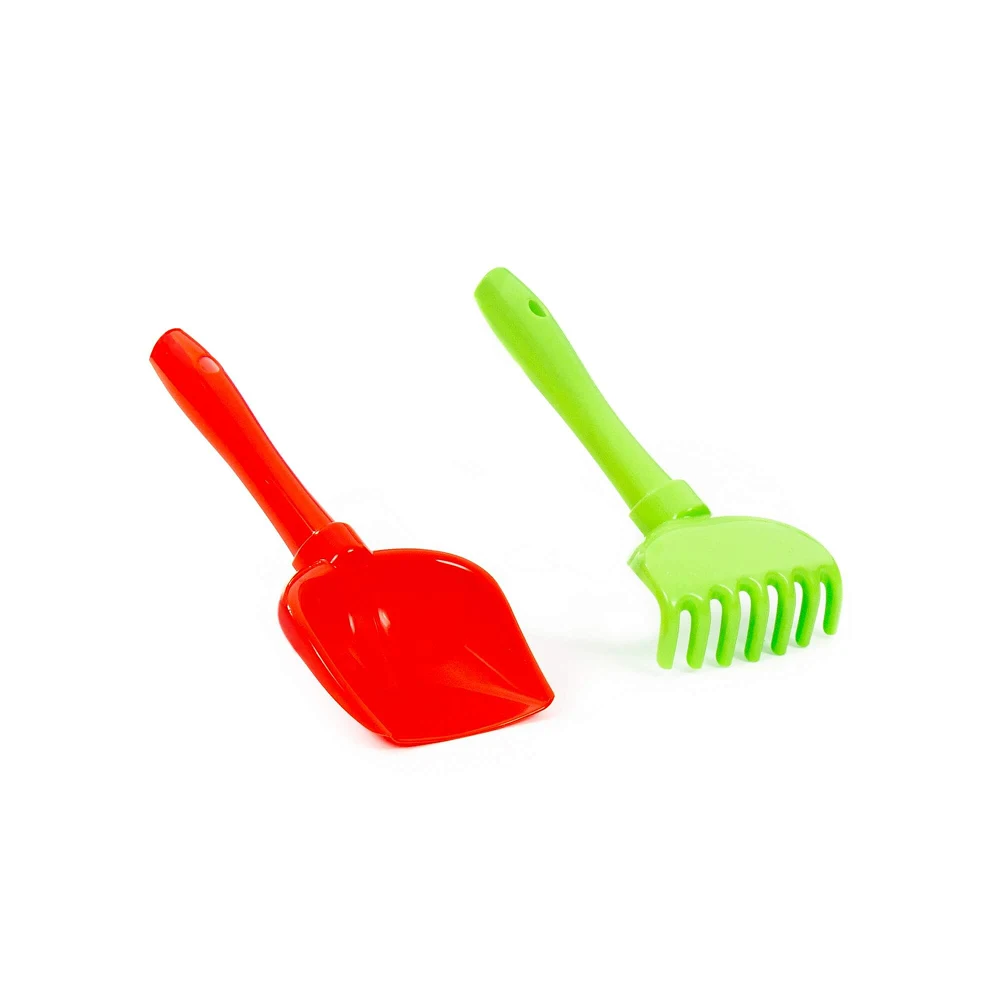 Set clasic pentru joaca în nisip, format din lopățică și greblă, ideal pentru joaca în aer liber, la plajă, în nisipar sau în grădină.