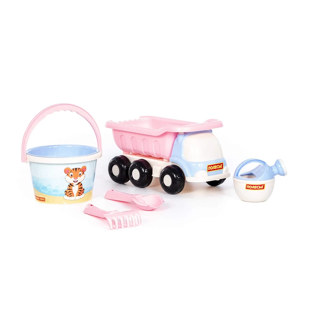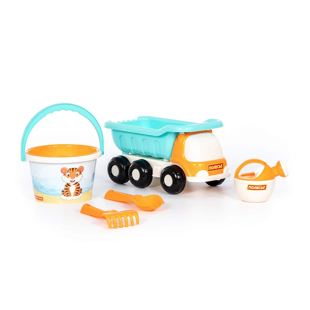 Set complet pentru joaca în nisip, cu camion basculant, găleată și accesorii, ideal pentru plajă, nisipar sau joaca în aer liber.