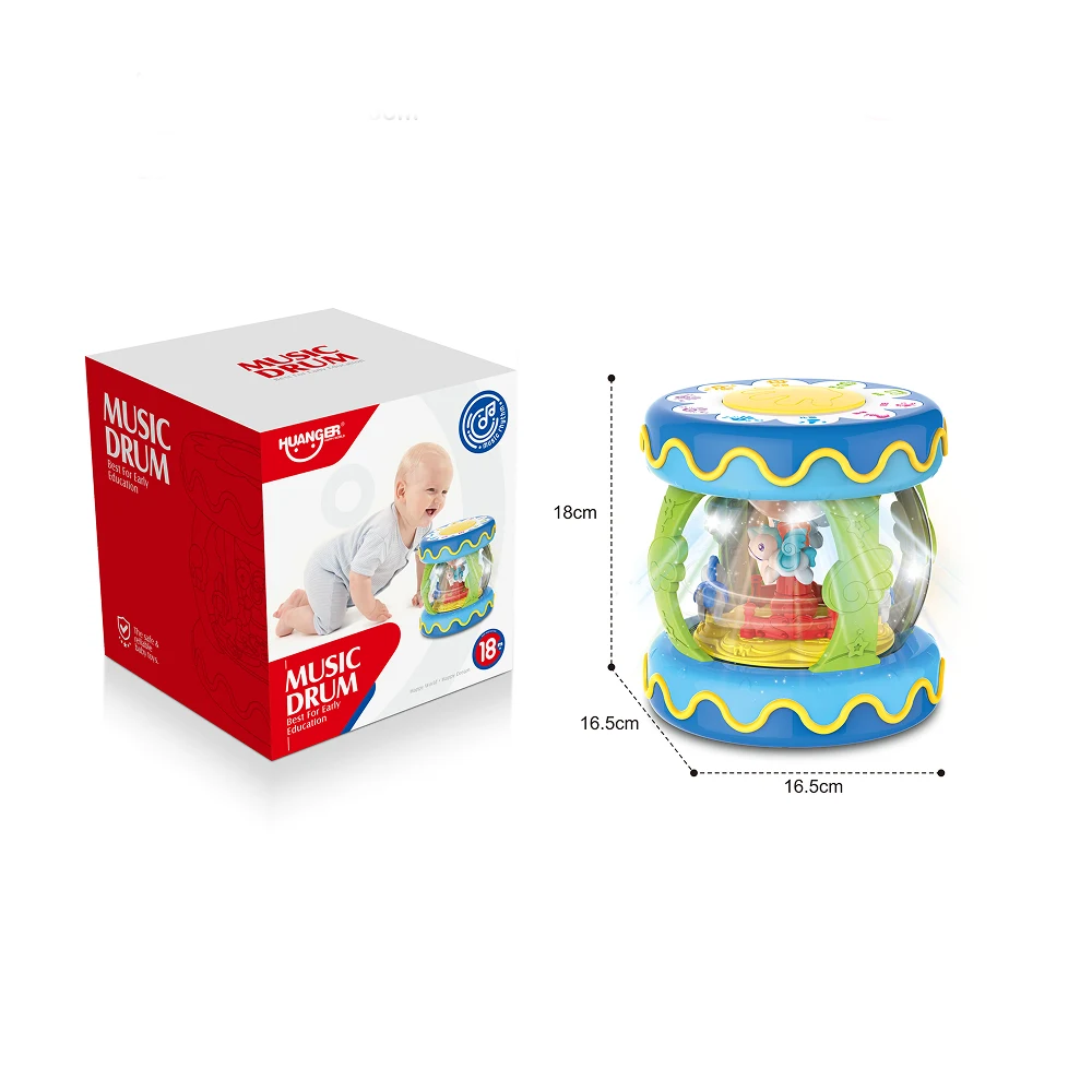 Tobă muzicală interactivă cu lumini și elemente mobile, concepută pentru stimularea simțurilor și joaca activă a bebelușilor.