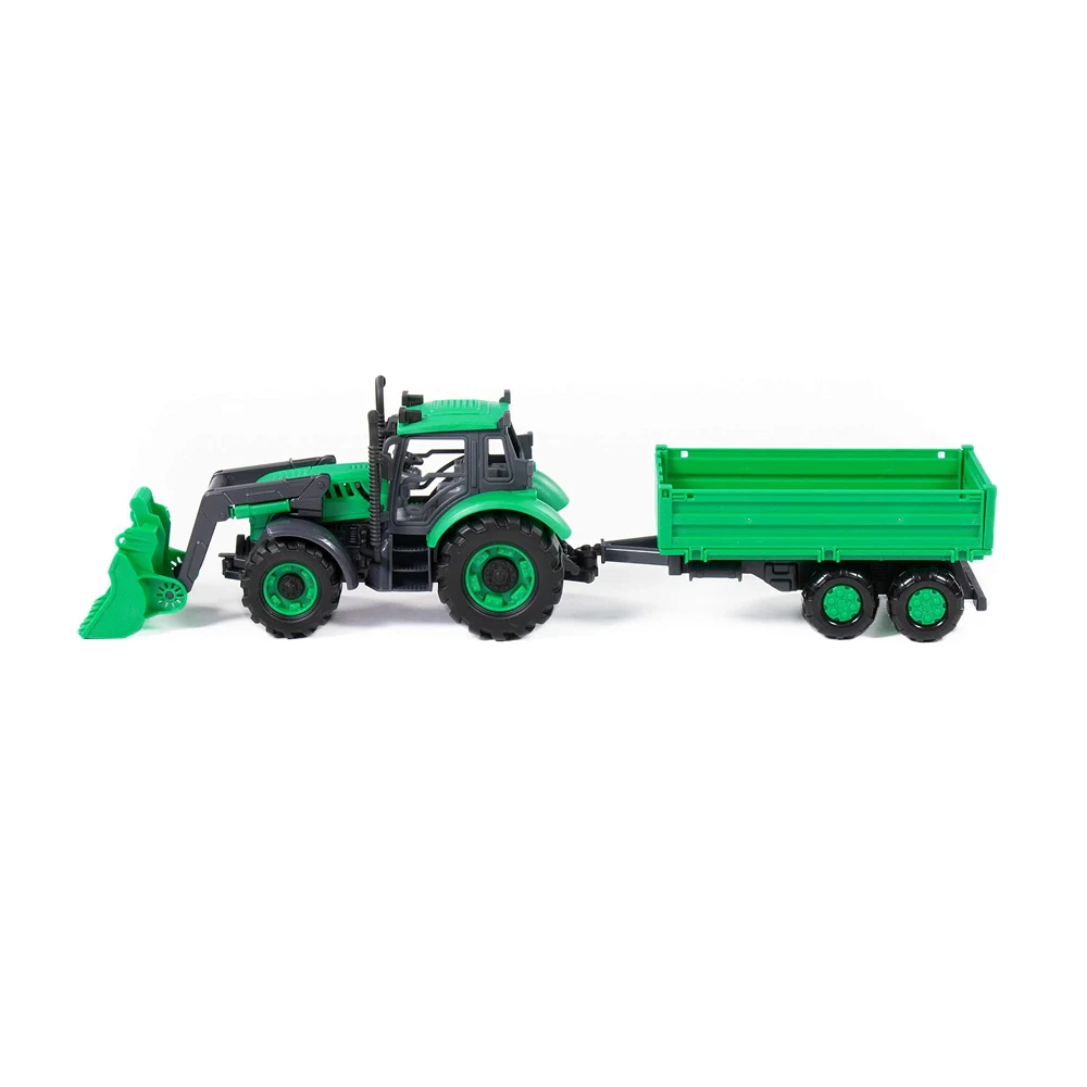 Tractor de jucărie cu inerție, echipat cu remorcă basculantă, ideal pentru jocuri de construcții și fermă. Design realist, culori atractive și funcții simple care stimulează joaca activă și imaginația copiilor.