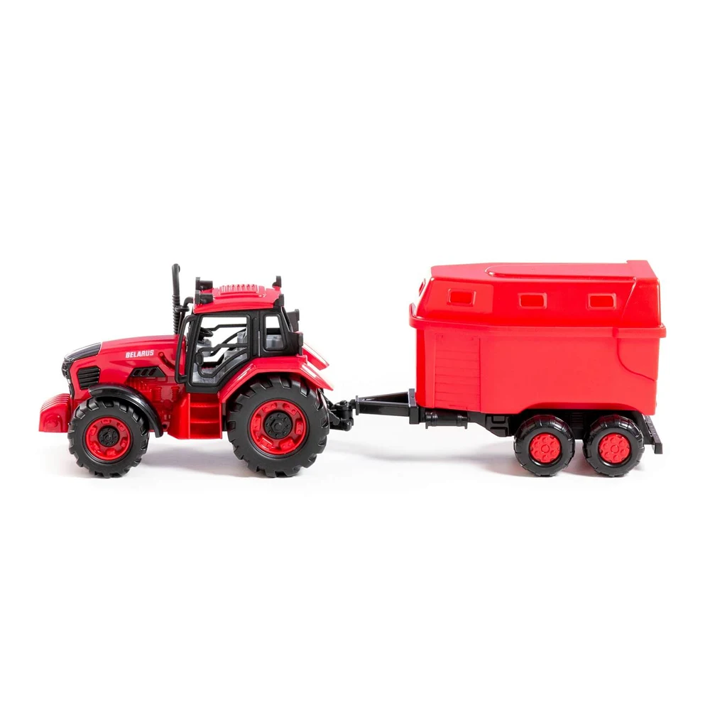 Tractor cu inerție Belarus, prevăzut cu remorcă pentru transportul animalelor, ideal pentru jocuri de fermă și joacă de rol.