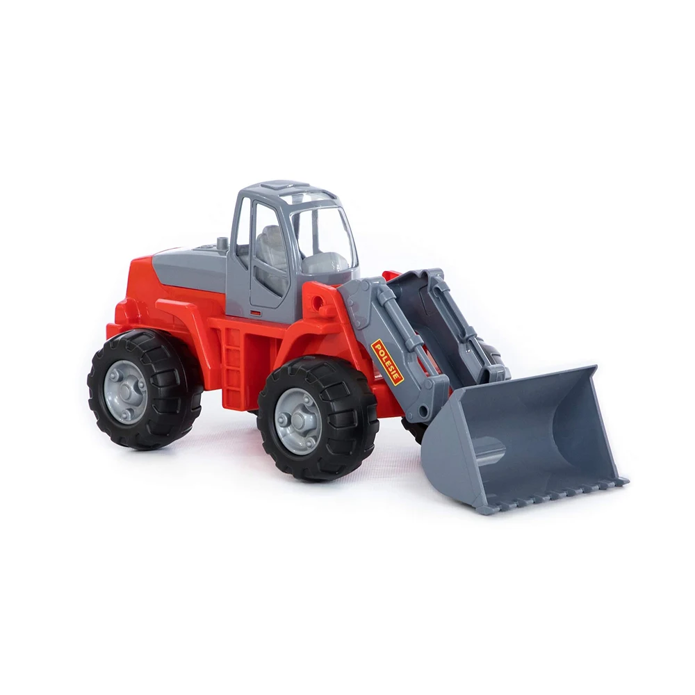 Tractor încărcător de jucărie cu cupă frontală, ideal pentru jocuri de construcție și jocuri de rol. Design realist și construcție robustă, potrivit pentru joacă zilnică.