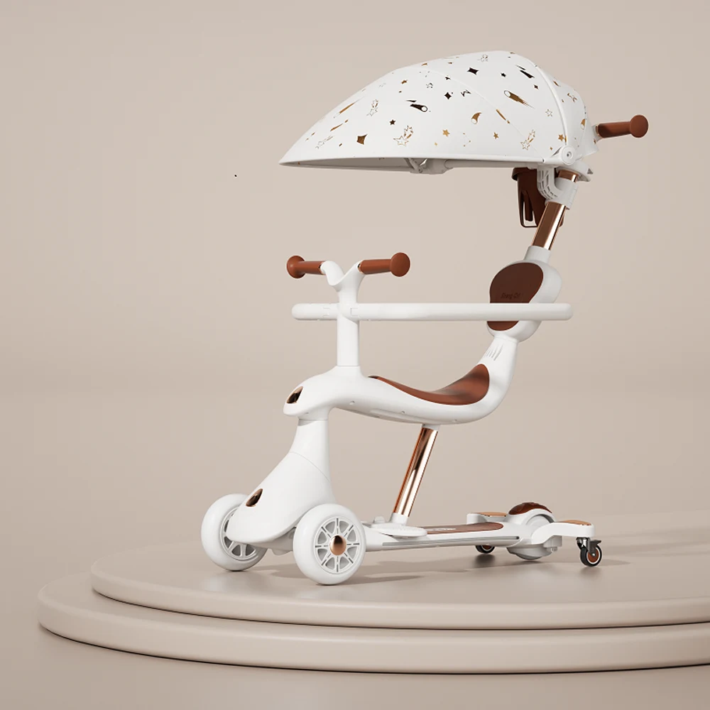 Trotineta pentru copii este un model transformabil conceput pentru plimbări confortabile și sigure. În prima etapă, trotineta poate fi utilizată cu scaun, mâner parental, inel de protecție și parasolar, oferind sprijin și control suplimentar pentru părinți în timpul deplasărilor. Pe măsură ce copilul crește, aceste elemente pot fi detașate, iar trotineta se transformă într-o trotinetă clasică cu 3 roți, potrivită pentru utilizarea independentă.